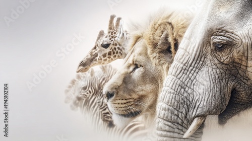 Fototapeta premium Majestic African wildlife montage featuring lion, giraffe, elephant, and zebra in profile