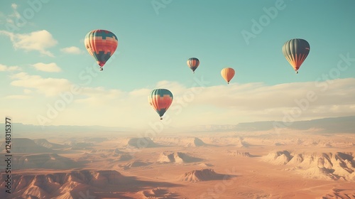 Naklejka premium Majestic air balloons gracefully floating above a vast picturesque landscape...