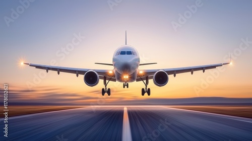 Obraz premium Majestic Airplane Landing at Sunset Over a Tranquil Runway