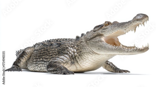 © Serhii, Naklejka premium Majestic Alligator with Mouth Agape Isolated Against a White Backdrop