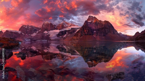 Obraz premium Majestic Alpine Glow Sunset Reflective Mountain Lake Serene Nature Scenery...
