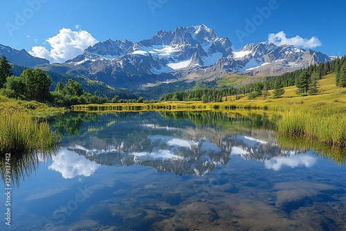 Fototapeta premium Majestic Alpine Lake Reflecting Snow-Capped Peaks