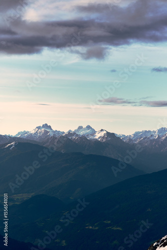 Fototapeta premium Majestic alpine mountains under a dramatic sky at dusk, showcasing the rugged...