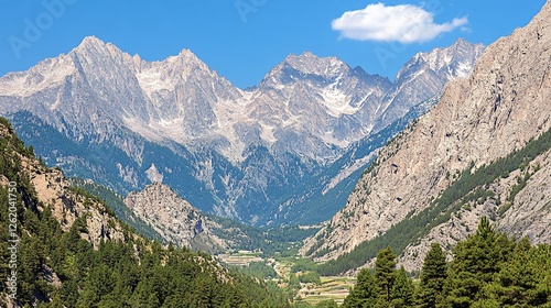 © Sarina, Fototapeta premium Majestic Alpine valley panorama, sunny day, clear sky