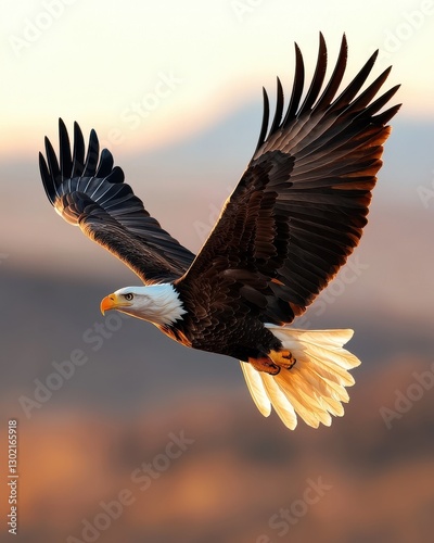 © xbzz, Obraz premium Majestic American Bald Eagle Soaring in Flight Against a Dreamy Sunset Sky