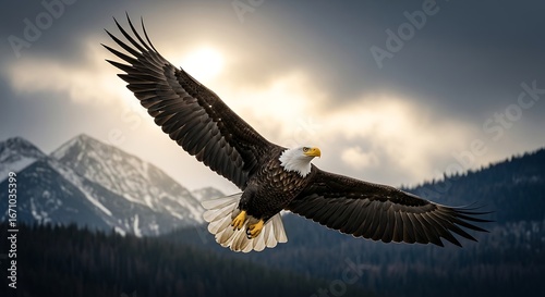 © Endruw, Obraz premium Majestic American Bald Eagle Soaring Over a Mountain Range.
