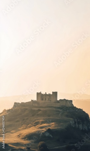 Obraz premium Majestic ancient castle perched on a hilltop during sunset, inviting...