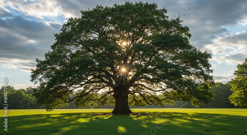 © Ahmad, Fototapeta premium Majestic ancient oak tree bathed in golden sunbeams, casting long shadows across a vibrant green meadow