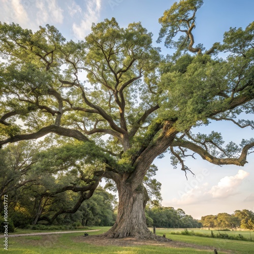 Obraz premium Majestic ancient oak tree spreading its branches wide in a tranquil park...