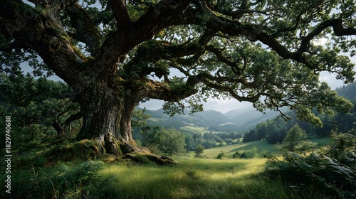 Fototapeta premium Majestic ancient oak tree with gnarled bark and massive sprawling branches...
