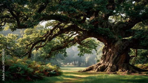 Fototapeta premium Majestic ancient oak tree with gnarled bark and massive sprawling branches...