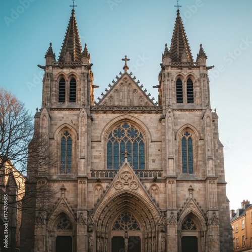Fototapeta premium Majestic ancient stone cathedral facade bathed in soft sunlight, showcasing...