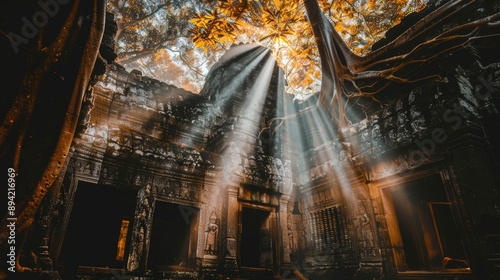 Naklejka premium Majestic Ancient Temple Covered in Overgrowth - Low Angle Shot (High Fidelity)