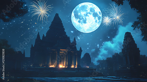 © Thiago, Naklejka premium Majestic ancient temple under bright blue moonlit sky with fireworks. Moonlit Temple. Illustration