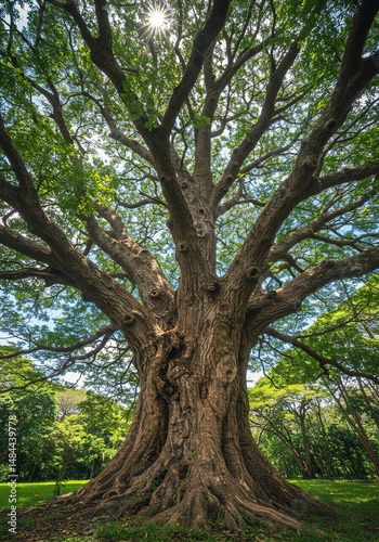 Naklejka premium Majestic Ancient Tree: Sunlit Canopy, Lush Green Foliage, Serene Nature Photography