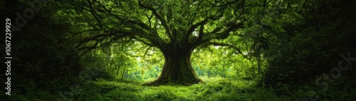 Naklejka premium Majestic ancient tree surrounded by lush greenery, creating a serene atmosphere in a vibrant forest setting, ideal for nature and landscape graphy.