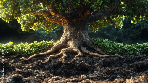 © Prasojo, Obraz premium Majestic ancient tree with exposed roots and lush green foliage in soft sunlight.