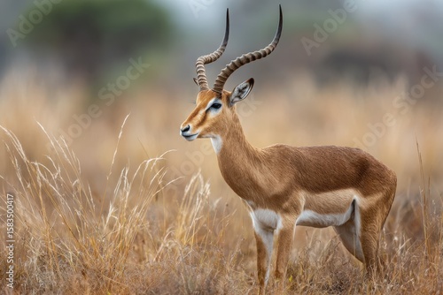 © john, Naklejka premium Majestic antelope standing gracefully in golden grassland during a misty morning
