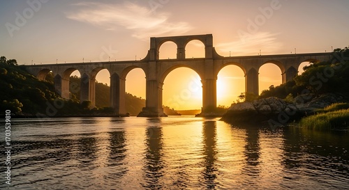 © Jerome, Obraz premium Majestic Aqueduct at Sunset - A Stunning Reflection on the Water.