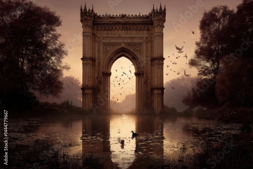 © Lavish, Fototapeta premium Majestic archway structure over a tranquil pond at dawn.