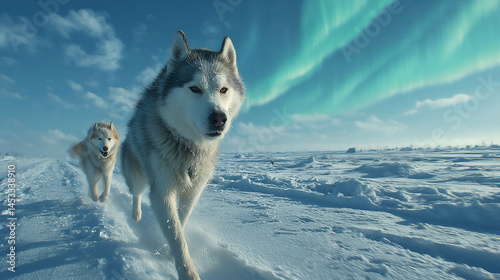 Fototapeta premium Majestic Arctic Wolf Running in Snowy Winter Landscape – Explore the Powerful Wildlife in Remote Siberian Nature