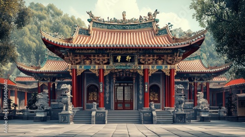 Fototapeta premium Majestic Asian temple, detailed facade, serene garden setting
