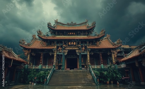 Fototapeta premium Majestic Asian temple under a dramatic sky. Ancient architecture, intricate details, serene atmosphere, grandeur, steeped in history