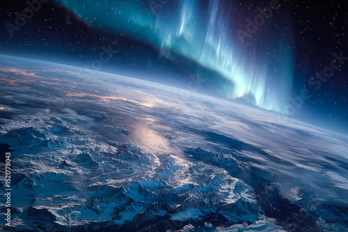© Tetiana, Naklejka premium Majestic aurora borealis dances over Earth’s landscape at twilight from a celestial perspective