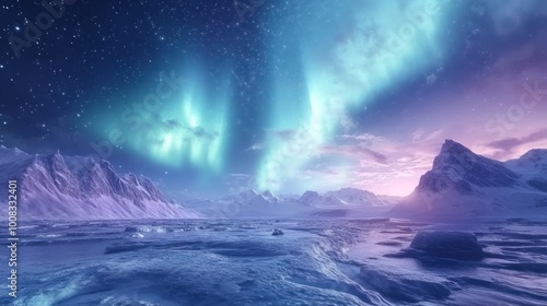 Naklejka premium Majestic Aurora Borealis Lights Up Snowy Mountain Range.