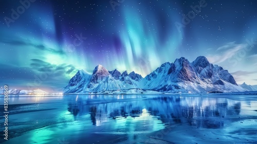 Naklejka premium Majestic aurora borealis over lofoten islands in norway: spectacular night sky illuminated with polar lights reflecting on tranquil winter waters