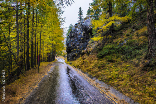 Obraz premium Majestic autumn alpine scenery with colorful larch forest,