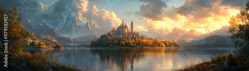 © Ibnu, Obraz premium Majestic Autumn Castle on Island Lake Surrounded by Mountains