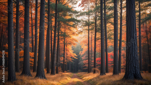 Fototapeta premium Majestic autumn forest with golden light illuminating path