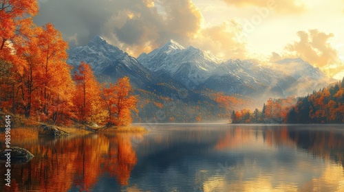 Fototapeta premium majestic autumn mountain landscape vibrant foliage misty peaks serene lake...