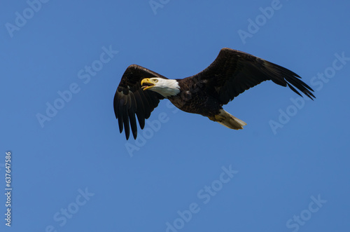 Obraz premium Majestic Bald Eagle flying high over Fishers Indiana on a summers day.