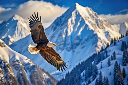 © anu, Fototapeta premium majestic bald eagle flying in front of snowy mountain