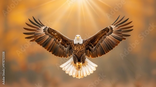 Obraz premium Majestic bald eagle flying with wings spread wide, illuminated by a golden...