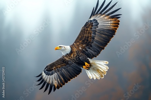 © Coffee Cafe Lover, Fototapeta premium Majestic Bald Eagle Gliding Through Misty Forest Landscape