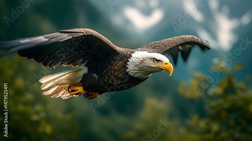 Fototapeta premium Majestic bald eagle gracefully gliding over a snow capped mountain forest...