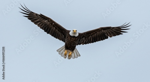 Obraz premium Majestic Bald Eagle in Flight Against Pale Sky