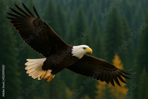 Obraz premium Majestic bald eagle in flight over evergreen forest