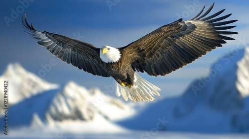 © Almahyra, Fototapeta premium Majestic bald eagle in flight over snow-capped mountains.