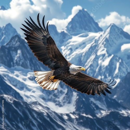 © Nur, Obraz premium Majestic bald eagle in flight over snow-capped mountains.