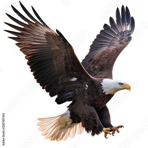 Fototapeta premium Majestic bald eagle in mid-flight with wide-spread wings and sharp talons, isolated on transparent background PNG