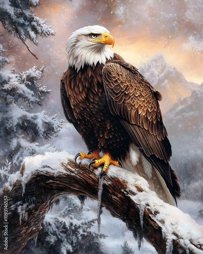 Obraz premium Majestic bald eagle perched on a snow-covered branch in a winter wonderland.