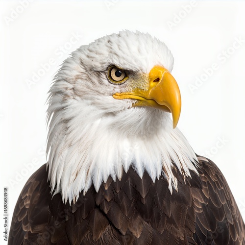 Fototapeta premium Majestic bald eagle portrait showcasing intense gaze and noble plumage on white background