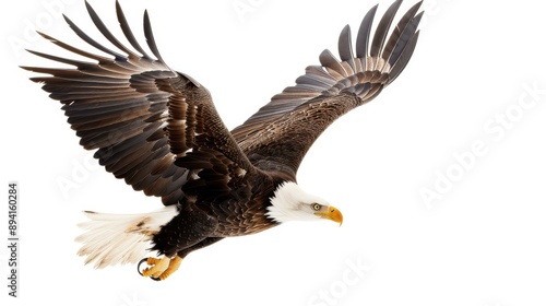 Obraz premium Majestic bald eagle soar gracefully against a clear white backdrop in this...