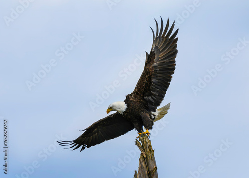 © Judit, Fototapeta premium Majestic bald eagle soaring above a tree during a clear blue sky
