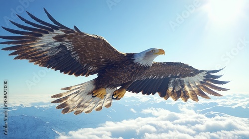 Fototapeta premium Majestic bald eagle soaring above mountainous cloudscape.