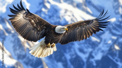 Fototapeta premium Majestic Bald Eagle Soaring Above Snowy Mountain Landscape